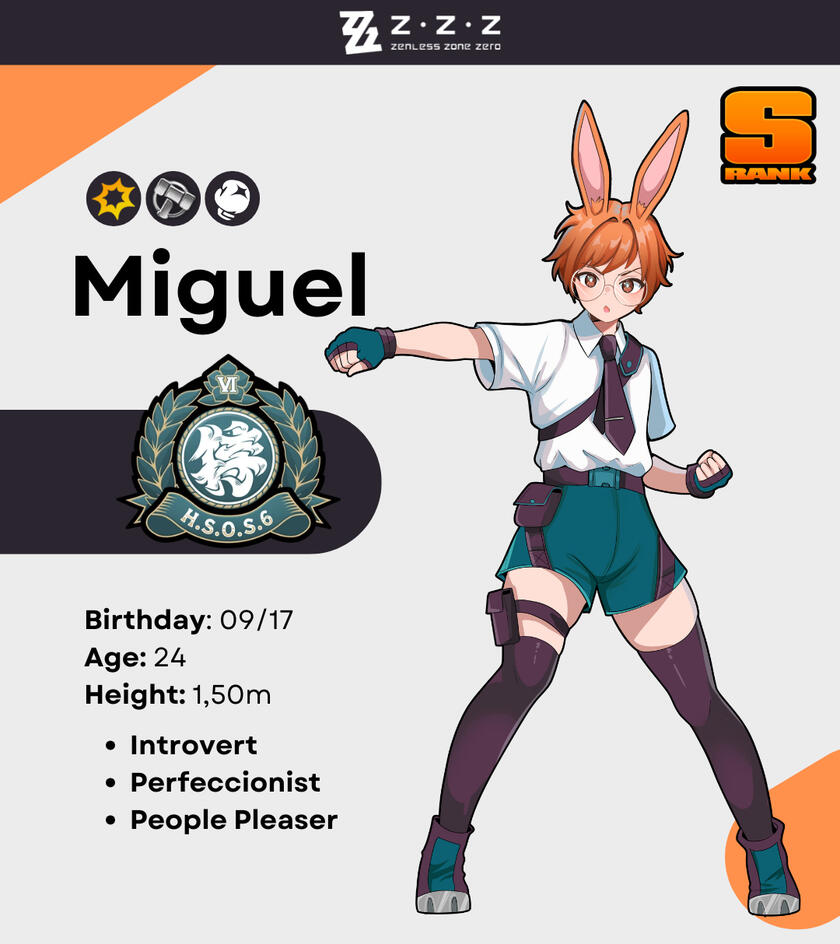 Miguel Zenn is a rabbit Thiren. What is a Thiren? inside the ZZZ universe, Thirens are humanoid creatures with animal characteristics. In Miguel's case, he's a human that has rabbit ears and a rabbit tail.He is a trans man and goes by he/him pronouns only. He doesn't intend on taking hormones, but he does want to get top surgery eventually.Despite his short stature and slim figure — which make look like he's too young for his actual age — Miguel is very skilled at fist fighting, which helped get his current job at Hollow Especial Operations Section 6 (or just Section 6 for short), a governmental unit dedicated to protecting the citizens of New Eridu (where ZZZ's story takes place).He is autistic with ADHD. Personality-wise, he's very introverted and struggles with holding casual conversations with most people. His sensory issues make him repulsed by other people's touch (expect for Harumasa's touch) and many types of food. He struggles a lot with executive dysfunction. His other disorders include depression, anxiety and PTSD. He's currently taking medicine for them.Miguel is my self insert. He is not an OC, he's just literally me inside the ZZZ universe, so I tried my best to make him as close to me as possible. He acts like me and looks like me (apart from the bunny features, of course, lol). So, please, be respectful towards his character.